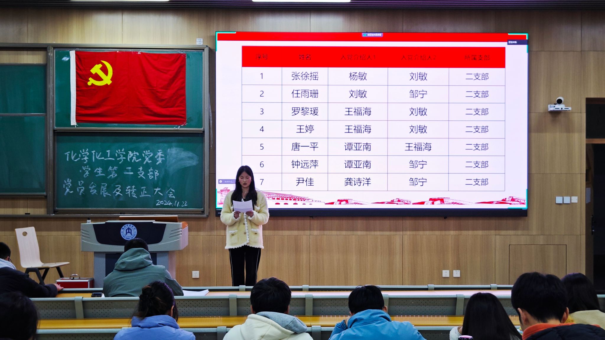 2024年11月22日晚,公司员工第二支部在明德楼B210教室召开了支部大会,研究讨论了2024年下半年党员发展及转正事宜。员工第二支部正式党员、预备党员、发展对象、入党介绍人等参与了此次会议。本次大会共六项议程: