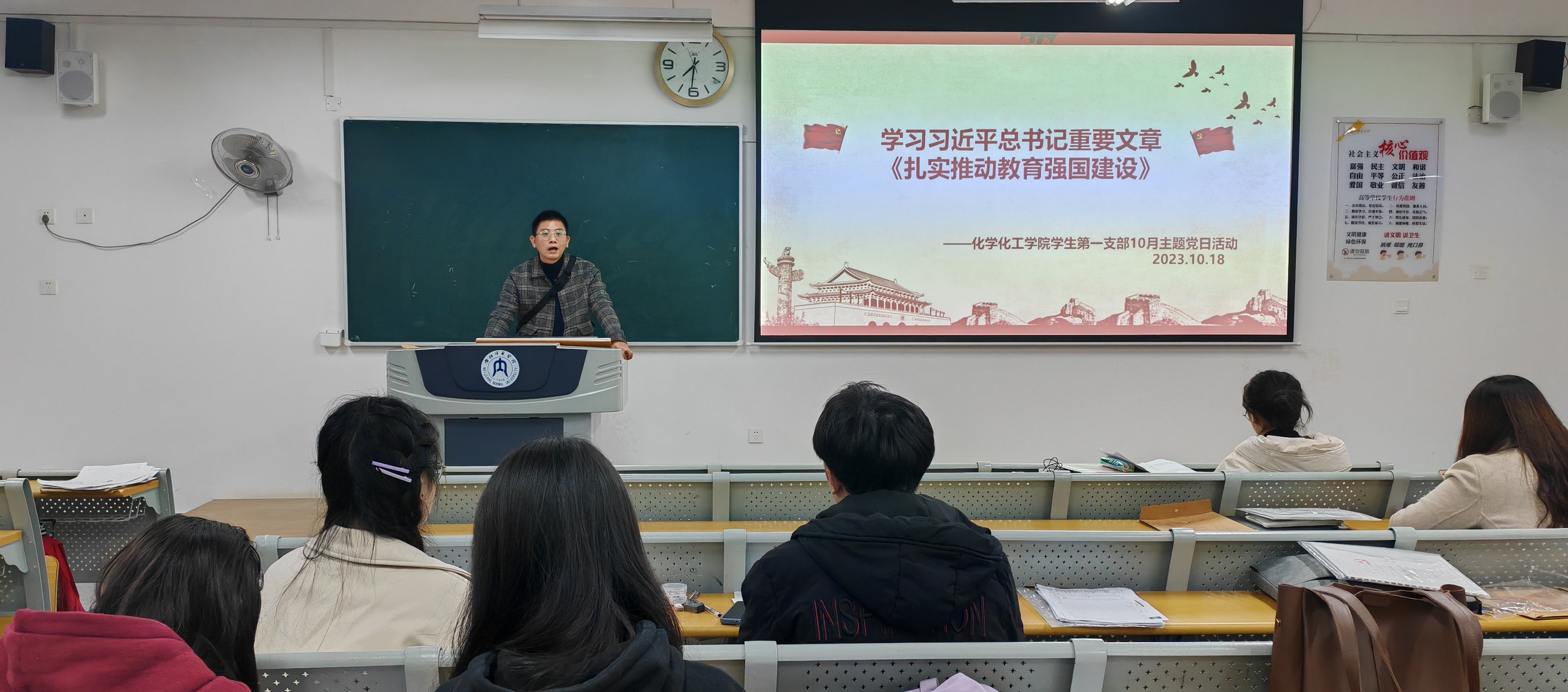 重教尚学是中华民族世代传承的优良传统,是中华民族生生不息的内在动力,化学化工公司员工第一党支部于2023年10月18日晚在明德楼B218以学习习近平总书记重要文章《扎实推动教育强国建设》为主题,开展了主题党日活动。活动由支部书记郑武主持,全体支部成员参与。