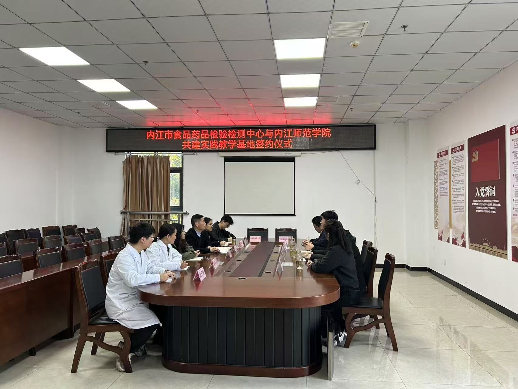 在实践教学基地,公司教师实地走访了员工实习岗位,参观了实习场所、详细了解实习内容、工作流程及安全保障措施。随后双方进行了座谈,内江市食品药品检验检测中心负责人郭艳波主任对中心的情况进行了详细的介绍。经理由耀辉介绍了化学化工公司的专业建设、团队队伍、仪器设备等情况。双方就人才培养、科学研究等方面开展合作进行广泛的讨论。最后,双方签订了共建实践教学基地协议并授牌。
