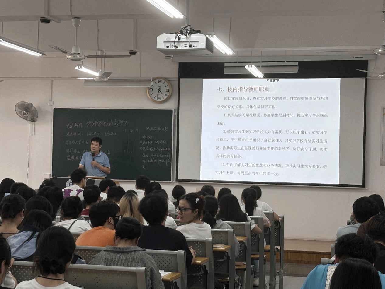 2024年6月27日下午4点20分,在明德楼B201教室,一场别开生面的教育实习动员大会隆重举行。此次大会是专门为即将步入实习岗位的2021级化学专业学子们准备的,旨在明确实习目的、形式、时间、内容和管理要求等方面,以帮助他们更好地完成实习任务。