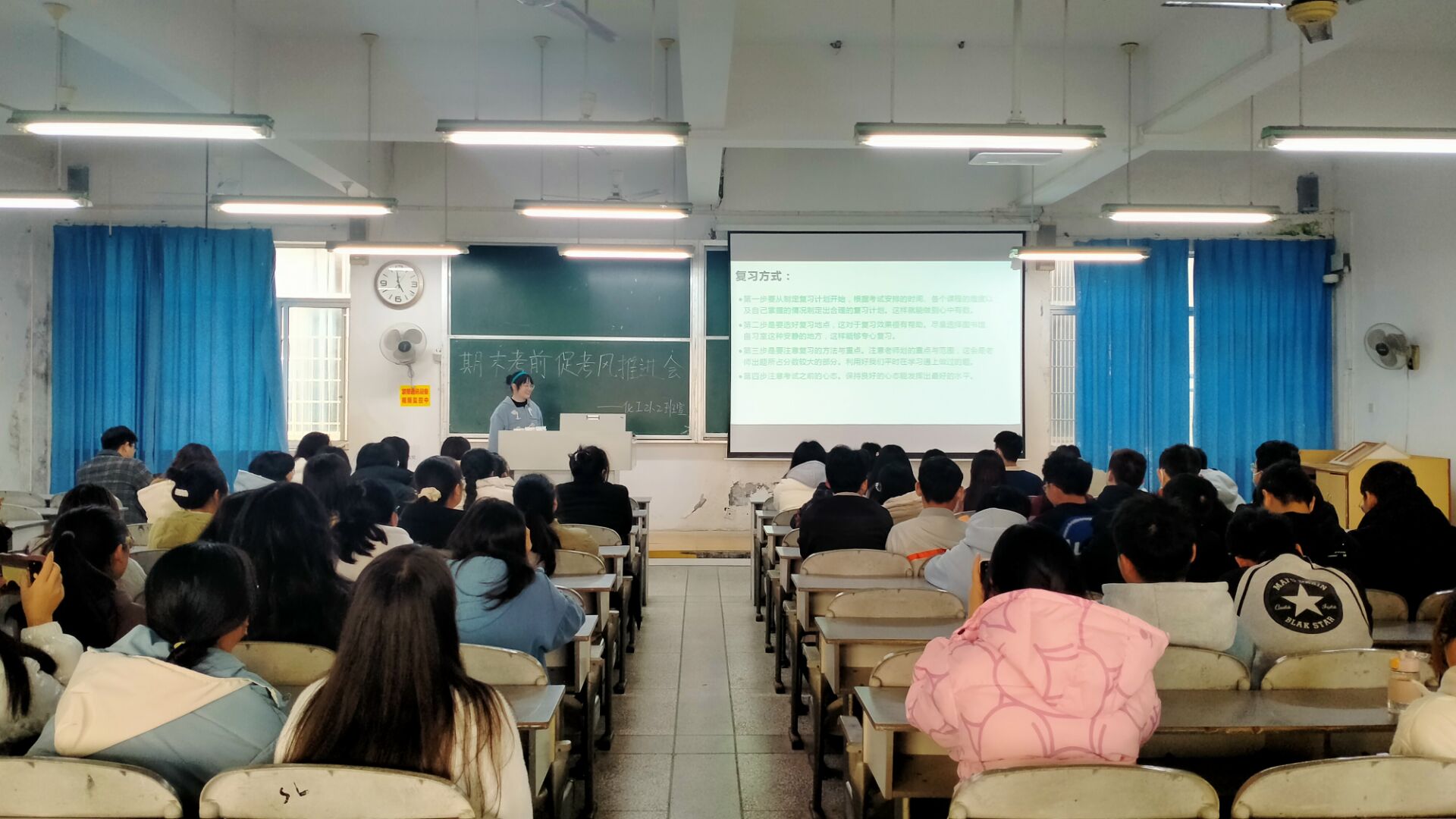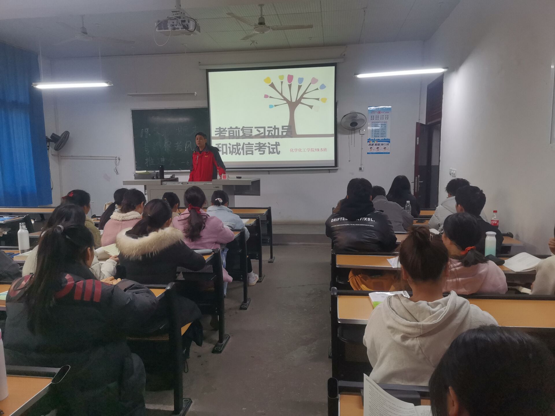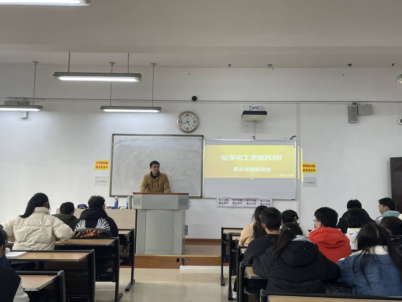 为进一步提高同学们端正考风、严肃考纪、诚信考试,化学化工公司于2021年12月2日至5日在第一教学楼和第五教学楼组织2019至2021级各班开展“期末考前促考风推进”主题班会。