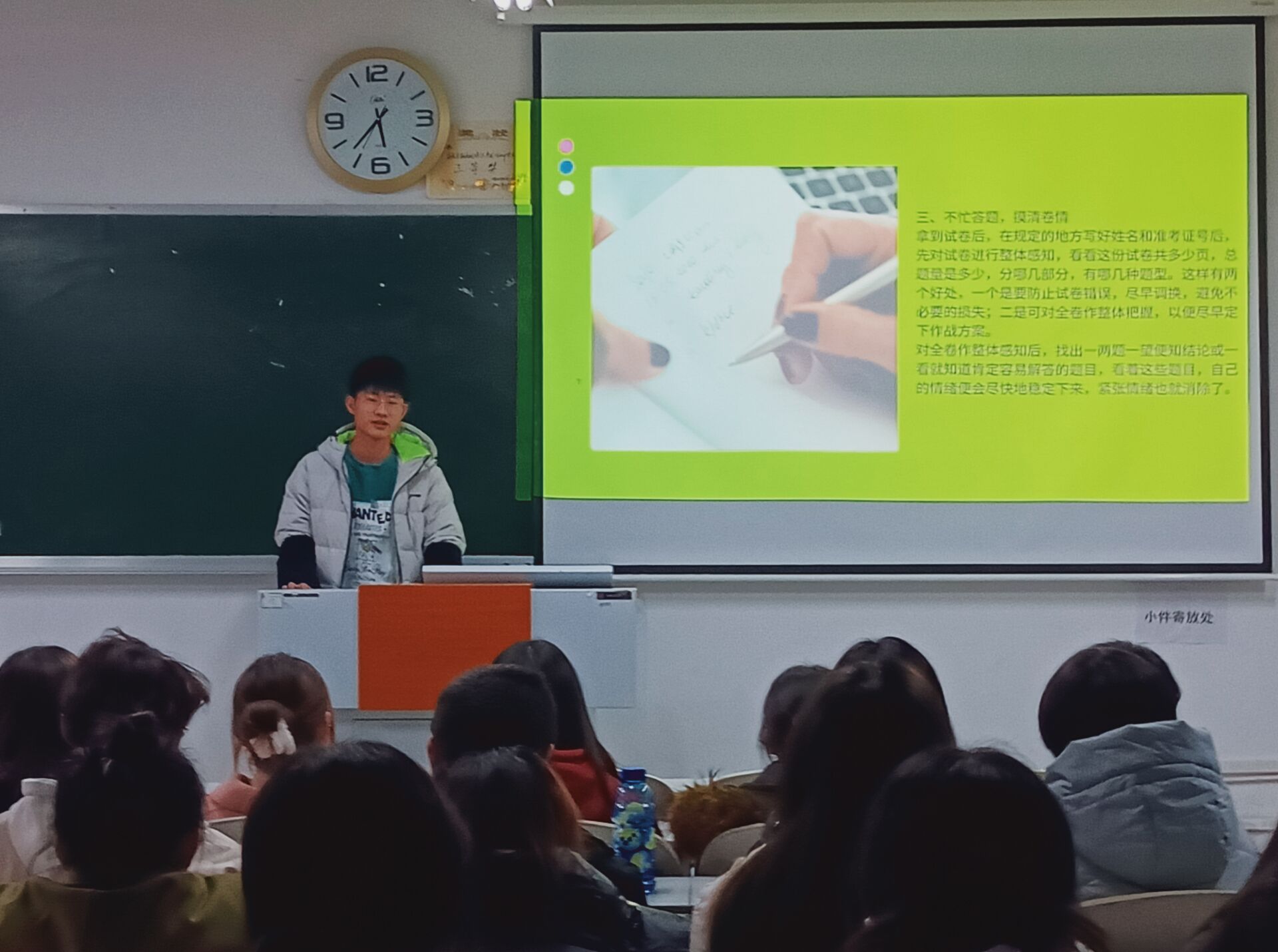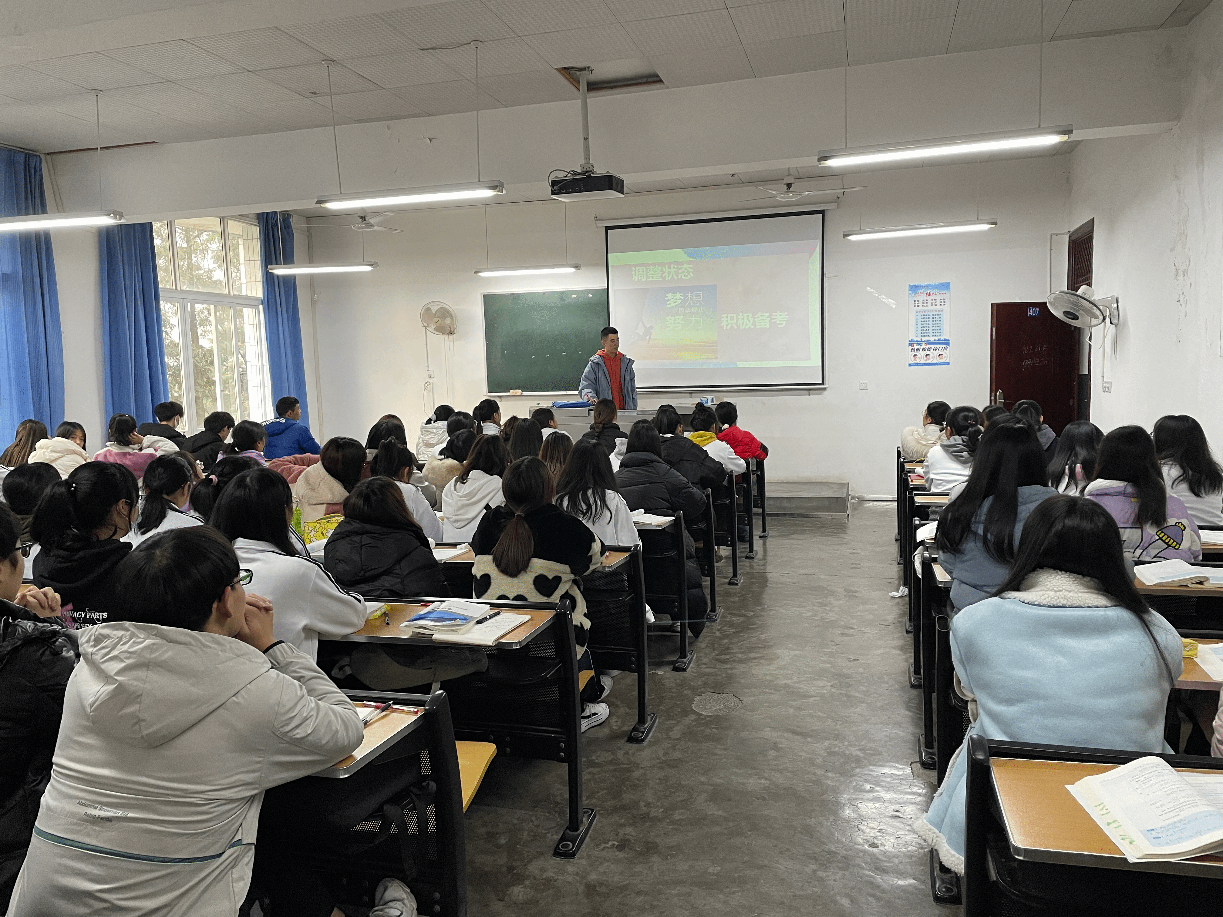 班主任易红明老师在2021级3班和4班班会上强调如何准备复习、如何制定目标、如何认识考试三个方面进行讲解。针对考纪考风提出三点要求:一是要求同学们要有计划、有针对性复习;二是要在考试过程中,要求同学们要严格遵守考试规章制度,杜绝一切形式的考试作弊,树立与不良风气作斗争的信心和勇气。三是在考试前一夜,早点休息,保持好睡眠质量。