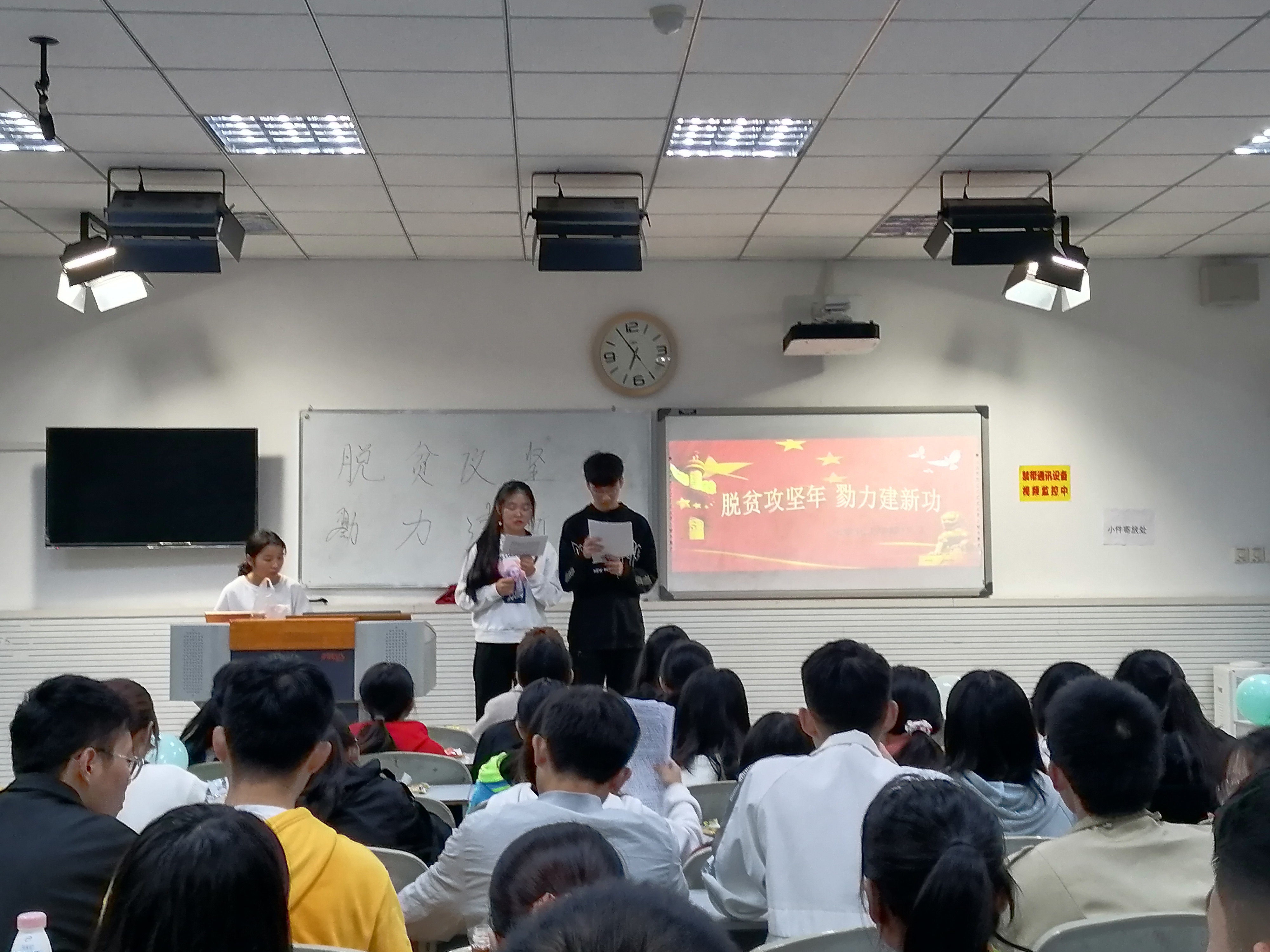 回顾脱贫攻坚政策方面:2019级3班主持人为同学们介绍了脱贫攻坚政策具体分为:精准扶贫、教育扶贫、健康扶贫、光伏扶贫、异地搬迁脱贫以及免费的职业培训。缅怀劳动模范方面:2018级3班主持人讲到在我国脱贫攻坚中涌现出了一大批坚守在扶贫一线的基层工作者,例如:劳动模范-管延萍,雪邦山“领头雁”-李青艳,获脱贫攻坚贡献奖-王小权等同志。2020级2班主持人带领同学们欣赏了歌曲《为了那份庄严的承诺》,让同学们更加坚信我们一定能打赢这场脱贫攻坚战。青年老员工勠力建新功方面:2020级4班主持人从独特的角度,解析了我们作为老员工应该做些什么,我们要守住成果,并逆流而上,争取取得更大突破。2018级7班主持人对老员工三下乡、爱心支教等社会活动与脱贫攻坚之间的关系进行了阐述,意在引导同学们实事求是的了解贫困的根源,结合自身的知识与技术,思考如何在实践中贡献自己的力量。