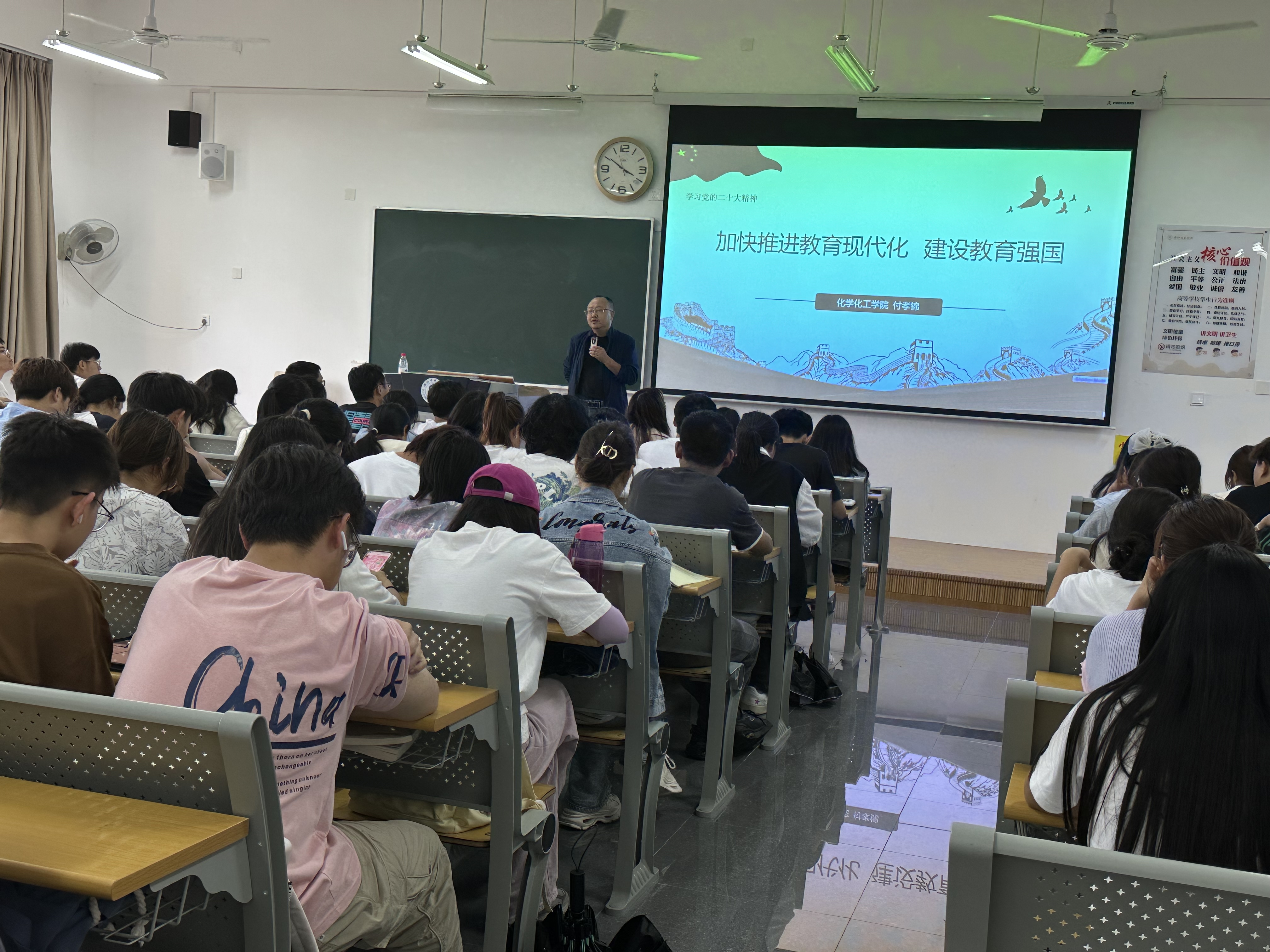 为深入学习宣传贯彻党的二十大精神,扎实开展学习贯彻习近平新时代中国特色社会主义思想主题教育,6月15日下午,化学化工公司党委副书记付孝锦老师以《加快推进教育现代化,建设教育强国》为题在明德楼A108给公司22级1班和2班员工讲授专题党课。