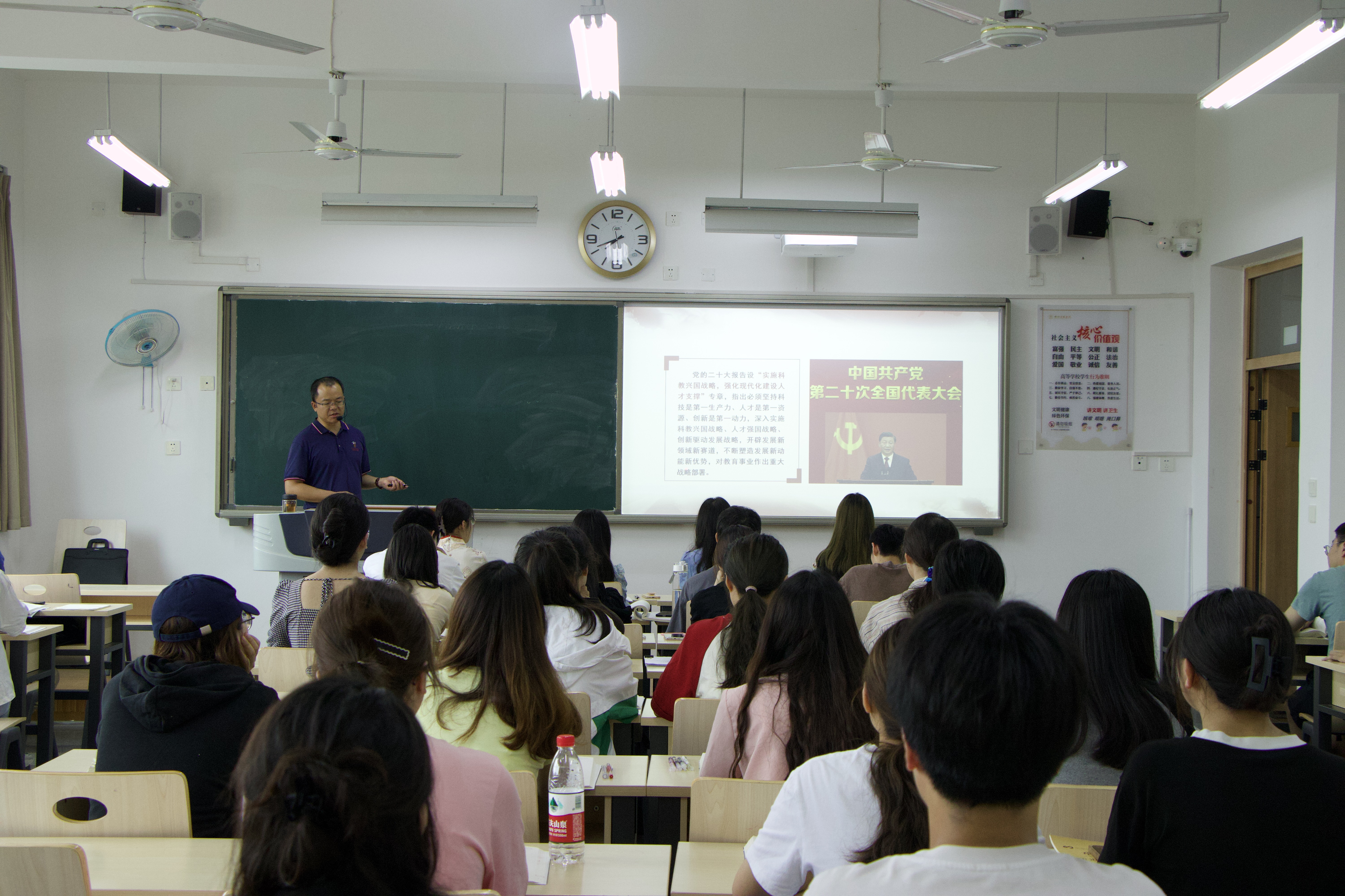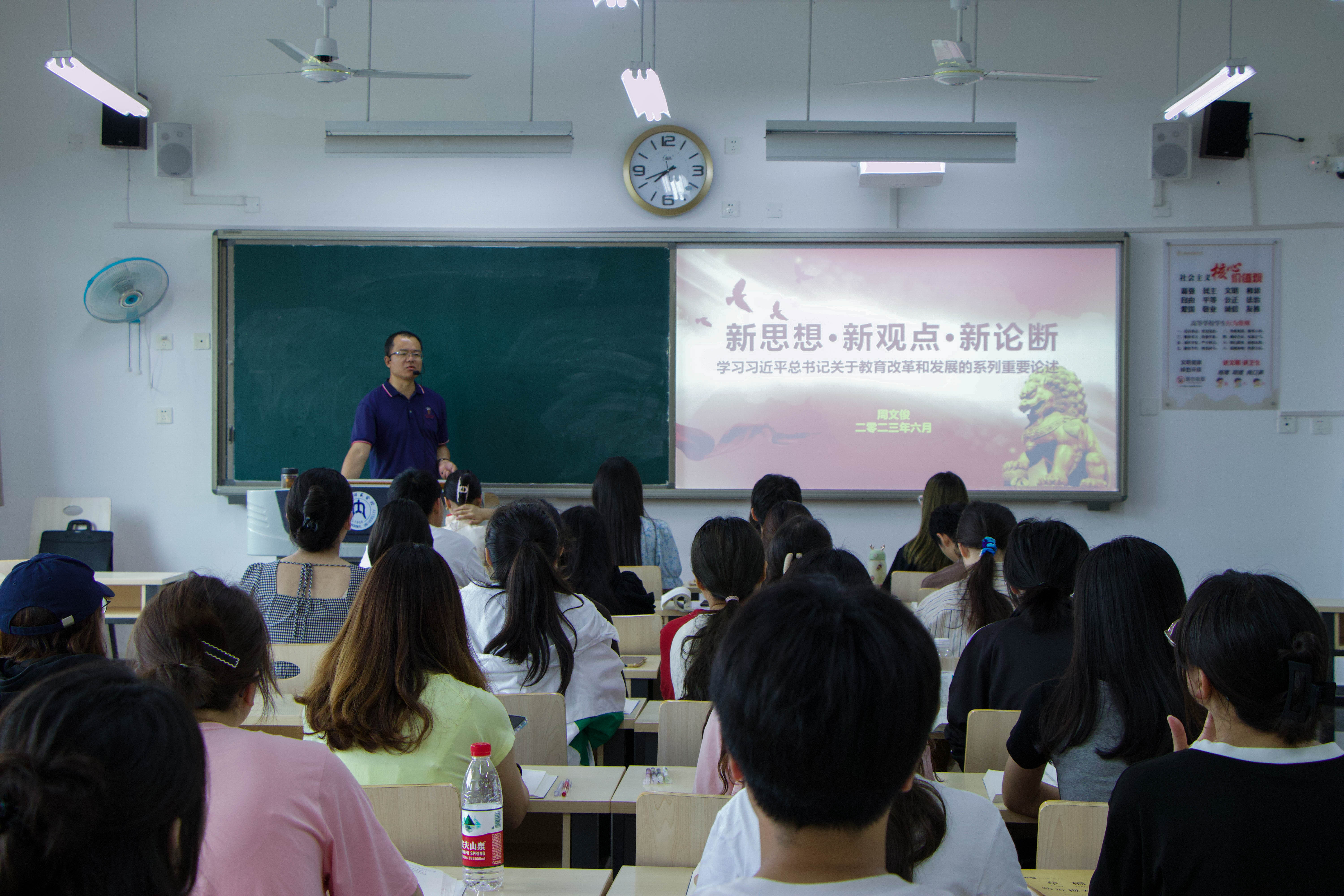 2023年6月21日下午,公司党委副书记、副经理(主持工作)周文俊以“新思想、新观点、新论断——学习习近平总书记关于教育的重要论述精神”为主题,在明德楼B317为2021级3班同学上了一节生动精彩的党课。