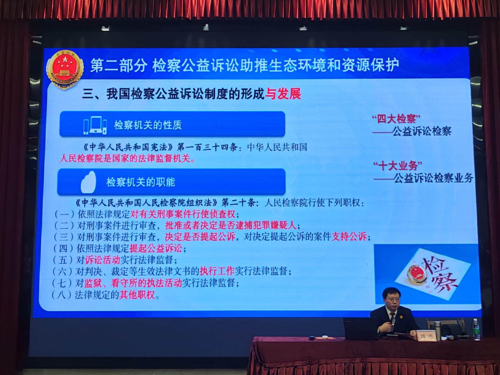 为动员引领全院团员和青年认真领会习近平新时代中国特色社会主义思想,做有理想、敢担当、肯奋斗的新时代好青年,在第十个国家宪法日来临之际,2023年12月3日,化学化工公司邀请内江市市中区人民检察公司党组书记、检察长魏勇莅临,以“检察公益诉讼制度与生态环境和资源保护”为题,在大千楼102会议室开展生态环境和资源保护领域检察公益诉讼专题法治讲座,公司党委副书记付孝锦和两百余名师生代表参加。