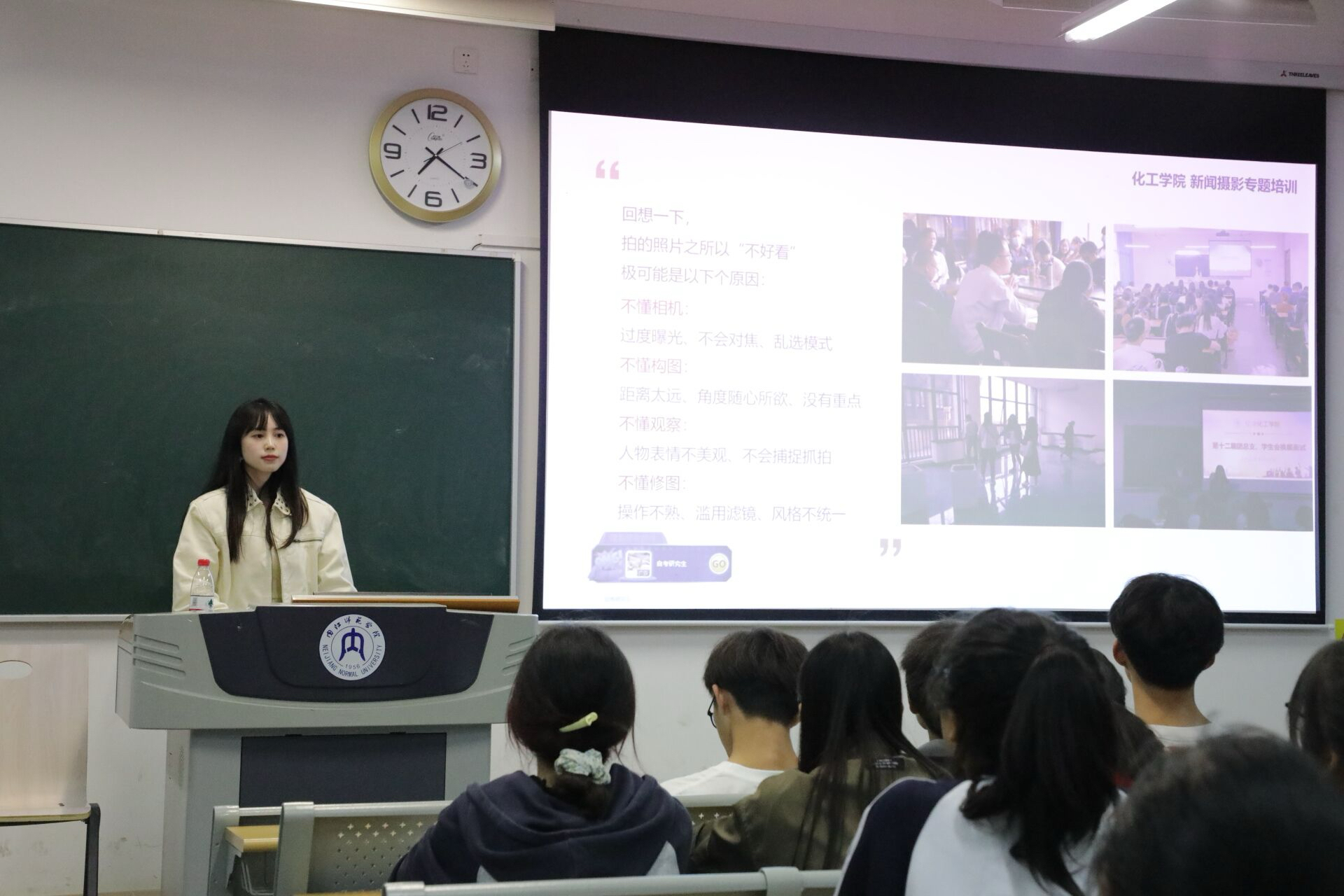 王佳惠老师主要讲解了摄影相关技巧和注意事项。在具体操作方面,她建议成员们从以下方面入手:第一,认识到手机与相机的主要区别在于便捷性和专业性。第二,拍摄前充分准备,如了解活动的时间、地点、人物,调试设备,测试光线角度等。第三,拍摄中全面考量,对于全景照、特写照、听众照、互动照、合照要具体情况具体分析,做到清晰、标准、规范。第四,拍摄后细心检查,自行筛选满意的照片并以压缩包的形式上传。最后,希望同学们能够在实践中灵活运用本次培训会习得的拍摄技巧。