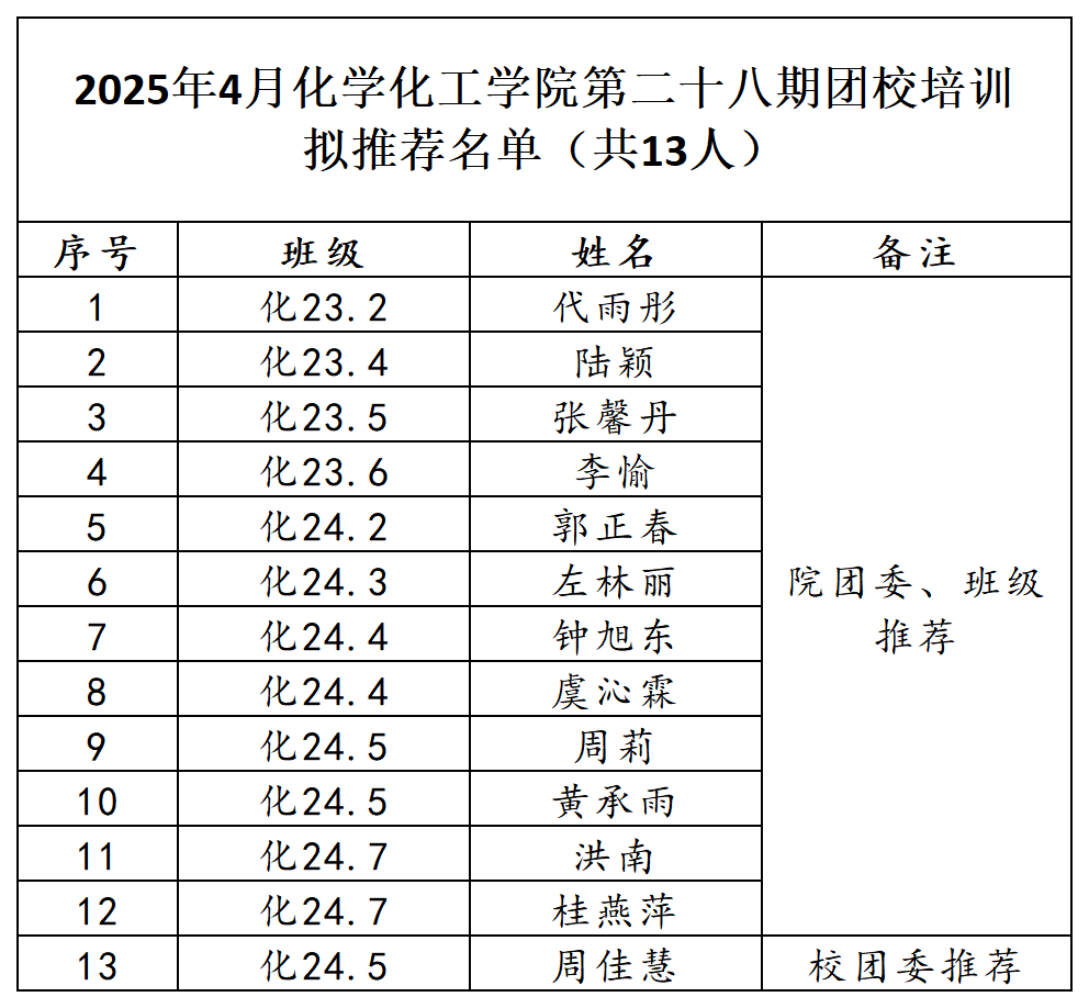 接校团委关于举办第二十八期团校通知,根据《中国共产主义青年团章程》和《中国共产主义青年团发展团员工作细则》(中青发〔2023〕13号)有关要求,公司严格依据推荐程序和条件要求,最终确定拟推荐名单如下: